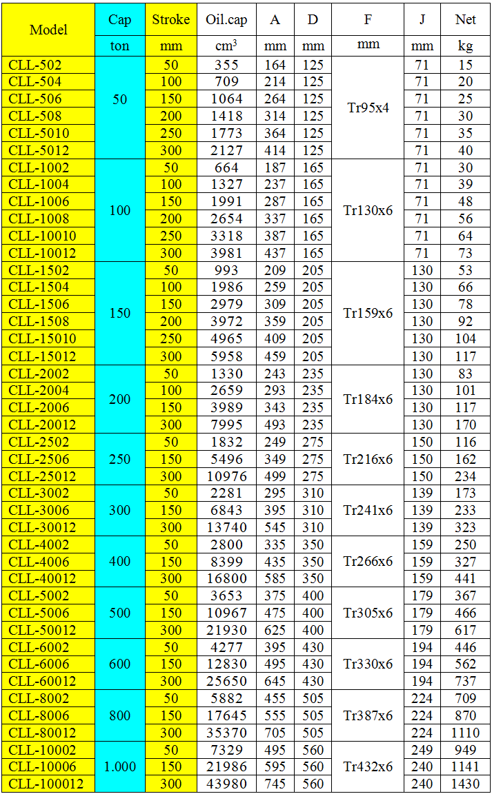 - Kích thủy lực CLL-2004, kích thủy lực vòng hãm CLL-2004, lock nut hydraulic jack CLL-2004: là loại kích thủy lực 1 chiều, vỏ thép, trang bị vòng hãm khóa tải, loại lớn có sức nâng max: 200 tấn, hành trình max: 100 mm, áp họat động < 700 bar (10.000 psi). Được sản xuất copy theo tiêu chuẩn của Enerpac với các thông số tương tự.