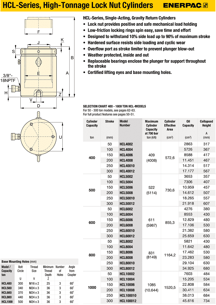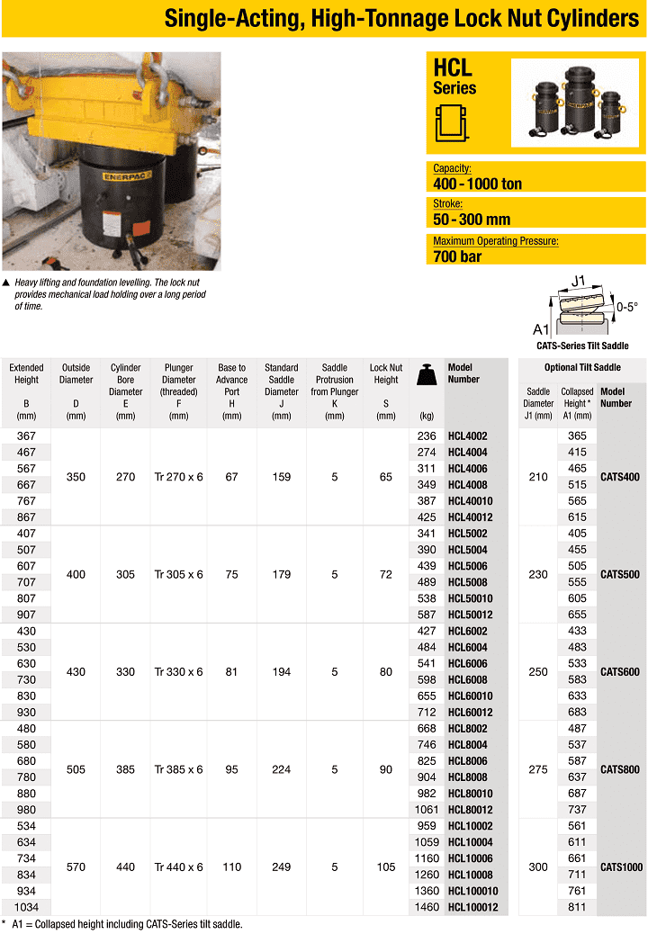 - Kích thủy lực vòng hãm Enerpac HCL-50012, Enerpac high tonnage lock nut hydraulic jack HCL-50012: là loại kích thủy lực, con đội thủy lực một chiều thân vỏ thép, loại lớn, trang bị vòng hãm khóa tải, có sức nâng max: 500 tấn, hành trình max: 300 mm, áp hoạt động < 700 bar (10.000 psi).