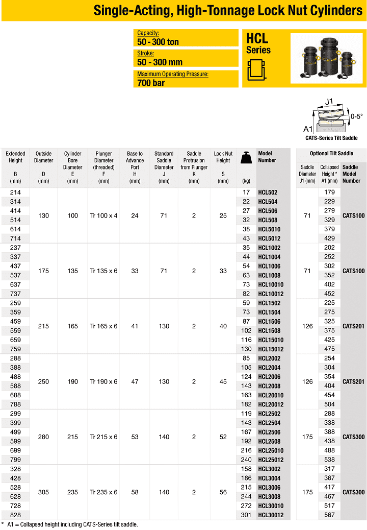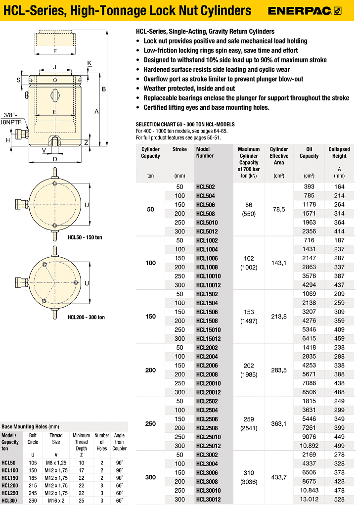 - Kích thủy lực vòng hãm Enerpac HCL-502, Enerpac high tonnage lock nut hydraulic jack HCL-502: là loại kích thủy lực, con đội thủy lực một chiều thân vỏ thép, loại lớn, trang bị vòng hãm khóa tải, có sức nâng max: 50 tấn, hành trình max: 50 mm, áp hoạt động < 700 bar (10.000 psi).