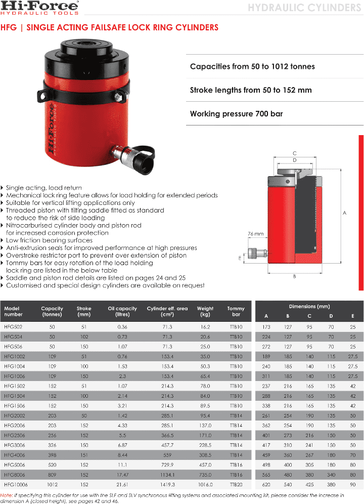 - Kích thủy lực vòng hãm Hi-Force HFG502, Hi-Force lock nut hydraulic jack HFG502: là loại kích thủy lực, con đội thủy lực một chiều thân vỏ thép, loại lớn, trang bị vòng hãm khóa tải, có sức nâng max: 50 tấn, hành trình max: 51 mm, áp hoạt động < 700 bar (10.000 psi).
