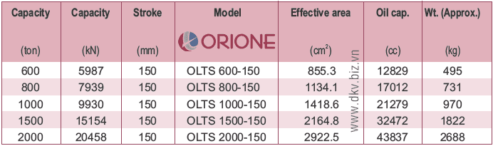 • Kích thủy lực Orione OLTS 600-150 thuộc dòng sản phẩm kích vòng hãm khóa tải, trang bị ren phía đầu kích (ren to và sâu) cùng đai vòng hãm khóa tải. Với ưu điểm nổi bật, giữ tải trọng ổn định, hạn chế tối đa sụt hành trình trong quá trình thi công. Đặc biệt cần giữ tải cố định trong một thời gian dài, như thi công cầu, hầm, nâng tổng đoạn đóng tàu....