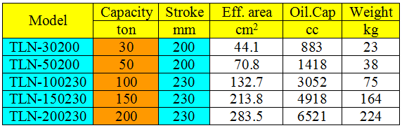 - Không trang bị lò xo hồi, việc hồi kích thủy lực Tecpos TLN-150230 nhờ đè nén thủ công hoặc tự trọng của xilanh.