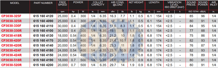 - Máy mài khí nén Chicago Pneumatic CP3030-325F có công suất: 300 W, tốc độ không tải: 25.000 rpm, được dùng rộng rãi trong các ngành công nghiệp sắt, đóng tàu, các nghành công nghiệp nhỏ, bảo dưỡng/bảo trì.