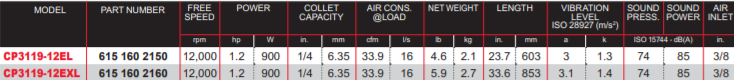- Lượng khí tiêu thụ của máy mài khí nén Chicago Pneumatic CP3119-12EXL: 16l/s, size kết nối nguồn khí nén: 3/8".