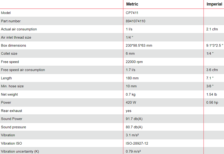 - Lượng khí tiêu thụ của máy mài khí nén Chicago Pneumatic CP7411: 1.7 l/s, size kết nối nguồn khí nén: 1/4".