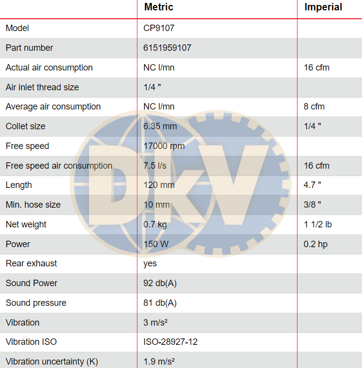 - Lượng khí tiêu thụ của máy mài khí nén Chicago Pneumatic CP9107: 7.5 l/s, size kết nối nguồn khí nén: 1/4".