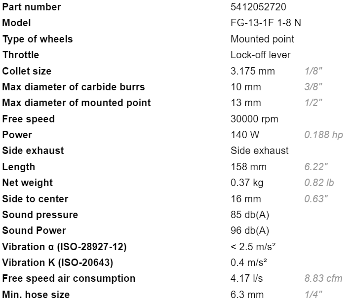 - Lượng khí tiêu thụ của máy mài khí nén Fuji FG-13-1F 1-8 N: 4.17 l/s, công suất động cơ: 140 W, size ống dây kết nối nguồn khí nén: 6.3 mm.