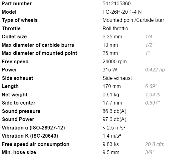 - Lượng khí tiêu thụ của máy mài khí nén Fuji FG-26H-20 1-4 N: 9.83 l/s, size kết nối nguồn khí nén: 3/8".