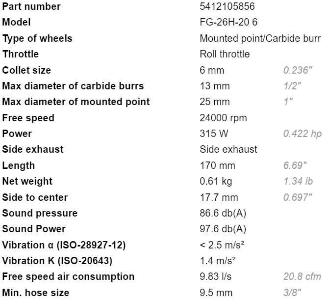 - Lượng khí tiêu thụ của máy mài khí nén Fuji FG-26H-20 6: 9.83 l/s, size kết nối nguồn khí nén: 3/8".