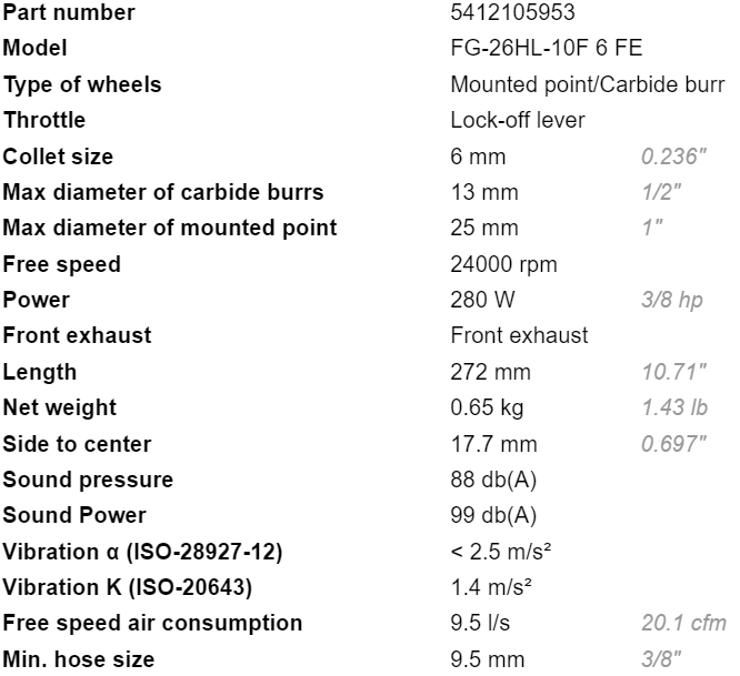 - Lượng khí tiêu thụ của máy mài khí nén Fuji FG-26HL-10F 6 FE : 9.5 l/s, công suất động cơ: 280 W, size ống dây kết nối nguồn khí nén: 3/8".