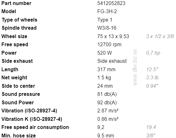 - Lượng khí tiêu thụ của máy mài khí nén Fuji FG-3H-2: 7.2 l/s, size ống dây kết nối nguồn khí nén: 3/8".