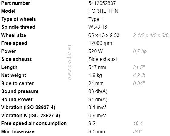 - Lượng khí tiêu thụ của máy mài khí nén Fuji FG-3HL-1F N: - l/s, size ống dây kết nối nguồn khí nén: 3/8".