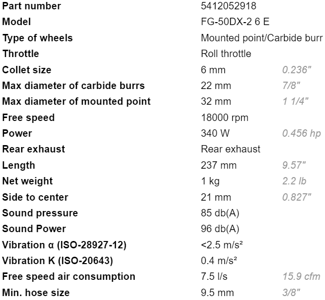 - Lượng khí tiêu thụ của máy mài khí nén Fuji FG-50DX-2 6 E: 7.5 l/s, size ống dây kết nối nguồn khí nén: 9.5 mm.