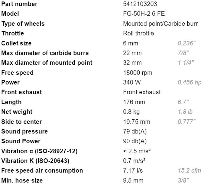 - Lượng khí tiêu thụ của máy mài khí nén Fuji FG-50H-2 6 FE: 7.17 l/s, công suất động cơ: 340 W, size ống dây kết nối nguồn khí nén: 9.5 mm.