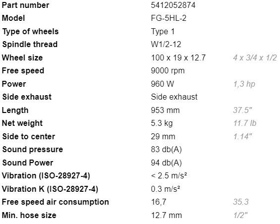 - Lượng khí tiêu thụ của máy mài khí nén Fuji FG-5HL-2: 16,7 l/s, size ống dây kết nối nguồn khí nén: 1/2".