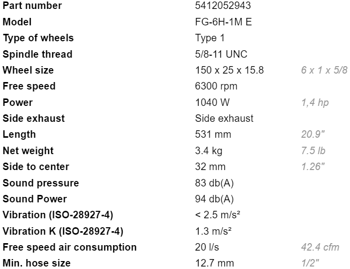 - Lượng khí tiêu thụ của máy mài khí nén Fuji FG-6H-1M E: 20 l/s, size ống dây kết nối nguồn khí nén: 1/2".