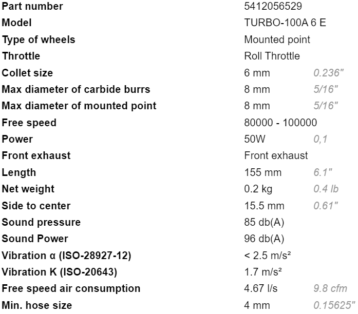 - Lượng khí tiêu thụ của máy mài khí nén Fuji TURBO-100 6 E: 4.67 l/s, công suất động cơ: 50 W, size ống dây kết nối nguồn khí nén: 4 mm.