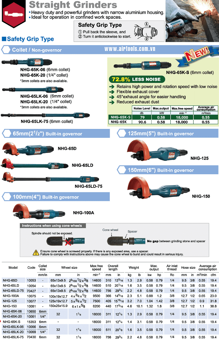 - Máy mài thẳng khí nén NPK NHG-65LK-75, NPK air straight grinder NHG-65LK-75: là loại máy mài thẳng, có công suất max: 0.58 kW, sử dụng đĩa mài đường kính max: 32 mm, tốc độ vòng quay trục chính max: 18.000 vòng/phút (khi không tải), để mài, cắt, đánh bóng những vật liệu có kích thước, bề mặt rộng lớn, nhiều bavia, được sử dụng chủ yếu trong các xưởng cơ khí, kết cấu thép.