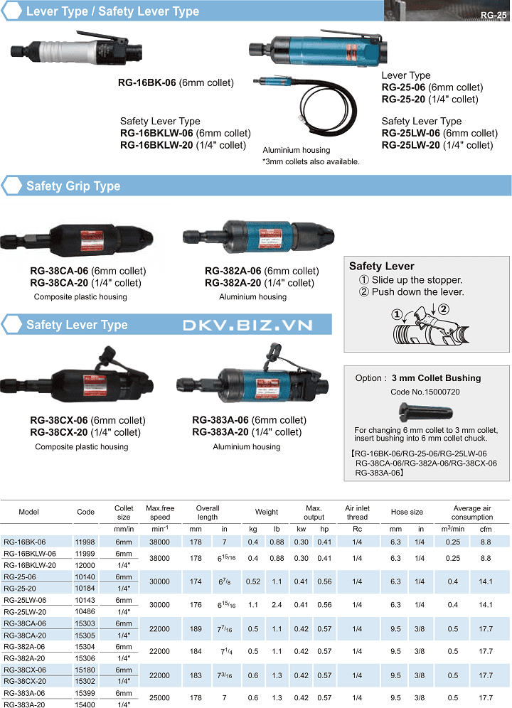 - Máy mài lỗ khí nén NPK RG-38CA-06, NPK air die grinder RG-38CA-06: là loại máy mài lỗ, có công suất max: 0.42 kW, sử dụng collet 6 mm kép chuôi đá mài, tốc độ vòng quay trục chính max: 22000 vòng/phút (khi không tải), để mài, cắt, đánh bóng những vật liệu dạng ống, lỗ, có kích thước, bề mặt cong rộng lớn, nhiều bavia, được sử dụng chủ yếu trong các xưởng cơ khí, kết cấu thép.