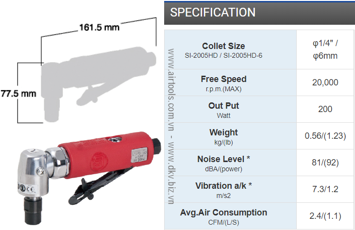 - Máy mài khí nén Shinano SI-2005HD có chiều dài: 161 mm, chiều cao: 77 mm, trọng lượng: 0.56 kg.