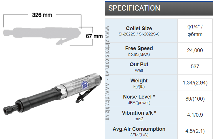 - Máy mài khí nén Shinano SI-2022S có chiều dài: 326 mm, chiều cao: 67 mm, trọng lượng: 1.34 kg.