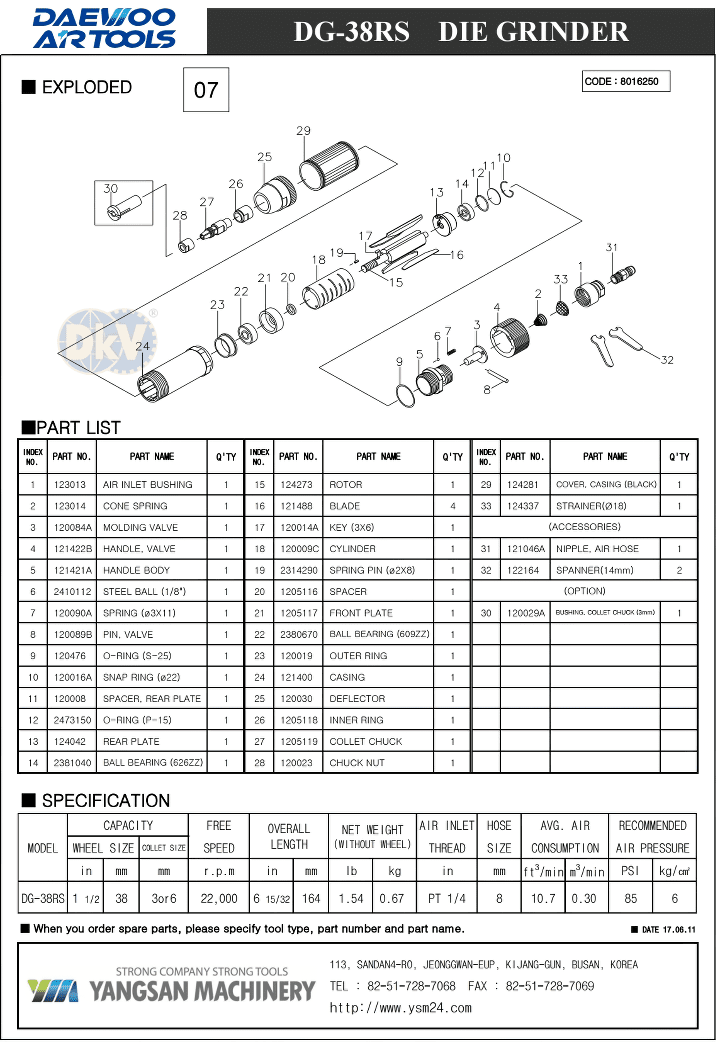 - Máy mài lỗ khí nén Daewoo DG-38RS được sản xuất bởi nhà sản xuất Yangsan Machinery - Busan - Hàn Quốc. Made in Korea (CO Phòng thương mại Hàn Quốc).