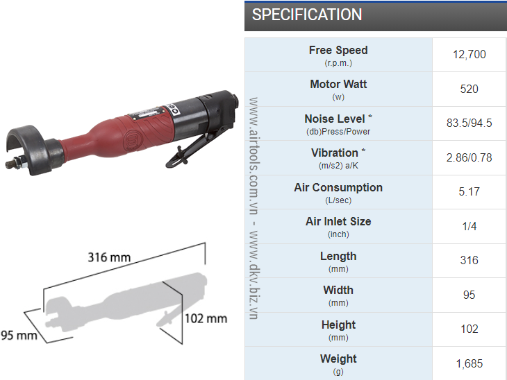 - Máy mài thẳng khí nén Shinano SI-SG3-3L có quy cách (dài x rộng x cao): 316 x 95 x 102 mm, trọng lượng: 1,685 g.