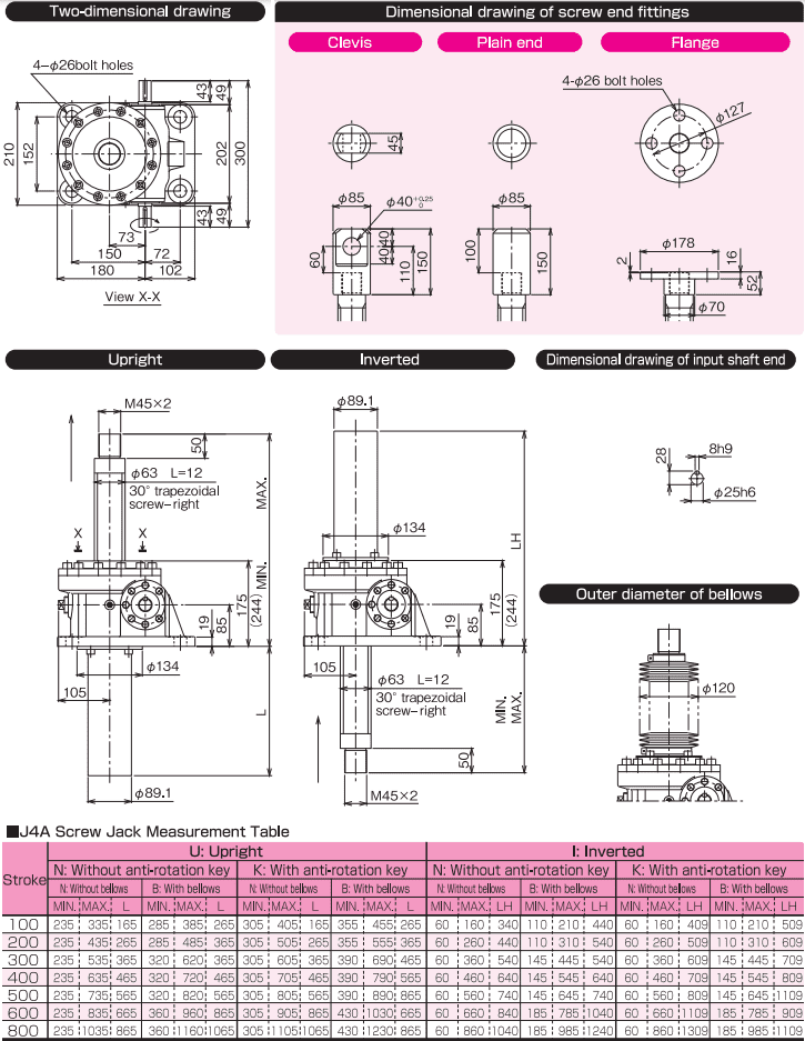 - Kích ren Nippon J4A, Nippon screw jack J4A: là loại kích thuần cơ khí, bản chất là liên kết trục ren/thanh ren, biến chuyển động từ động cơ giảm tốc thành chuyển động lên/xuống của trục ren, thông qua khớp nối, với 1 tỷ số truyền, tốc độ độ truyền nhất định.