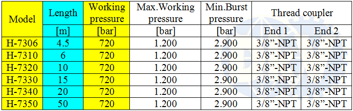 - Ống dây cờ lê thủy lực H-7306, Hydraulic torque wrench hose H-7306 có chiều dài 4.5 m, đường kính ống: 6.4 mm, dải áp hoạt động < 720 bar, áp max hoạt động: 1.200 bar, áp phá hủy (phát nổ): 2.900 bar, tổ hợp ren hai đầu: 3/8"-NPT, chuyên dùng cho các loại cờ lê thủy lực phổ dụng trong công nghiệp.
