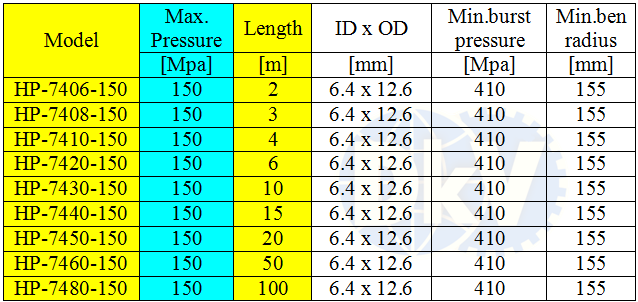 - Cấu hình của ống dây thủy lực nylon HP-7408-150: Vật liệu: nilon gia cường (Thermo plastic). Chiều dài: 3 m. Đầu ren ống: G1/4". Đường kính trong của ống: 1/4″ (6.4mm). Hoạt động ở áp: 1.500 bar (150 MPa). Áp phát nổ: 4.100 bar (410 MPa), đường kính uốn cong nhỏ nhất chịu được: 155 mm.