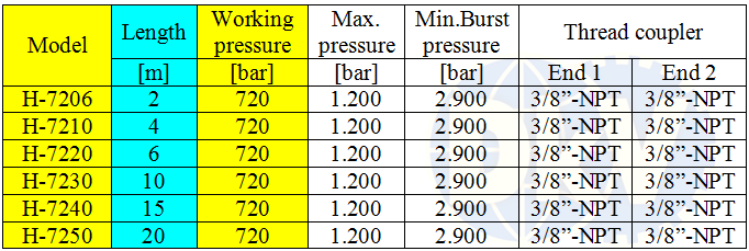 - Ống dây thủy lực nilon H-7206, Thermo plastic hydraulic hose H-7206 có chiều dài 2m, đường kính ống: 6.4 mm, dải áp hoạt động < 720 bar, áp max hoạt động: 1.200 bar, áp phá hủy (phát nổ): 2.900 bar, tổ hợp ren hai đầu: 3/8"-NPT, chuyên dùng cho kích thủy lưc, tools thủy lực phổ dụng trong công nghiệp.