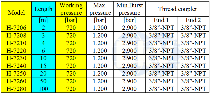 - Cấu hình của ống dây thủy lực nylon H-7206: Vật liệu: nilon gia cường (Thermo plastic). Chiều dài: 2 m. Đầu ren ống: 3/8″-NPT. Đường kính ống: 1/4″ (6.4mm). Hoạt động ở áp: 720 bar (72 MPa). Áp tới hạn: 1.200 bar (120 MPa). Áp phát nổ: 2.900 bar (290MPa).
