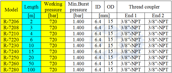 - Cấu hình của ống dây thủy lực cao su R-7208: Vật liệu: cao su gia cường (Rubber). Chiều dài: 3 m. Đầu ren ống: 3/8″-NPT. Đường kính ống: 1/4″ (6.4mm). Hoạt động ở áp < 720 bar (72 MPa). Áp phát nổ: 1.400 bar (140 MPa).