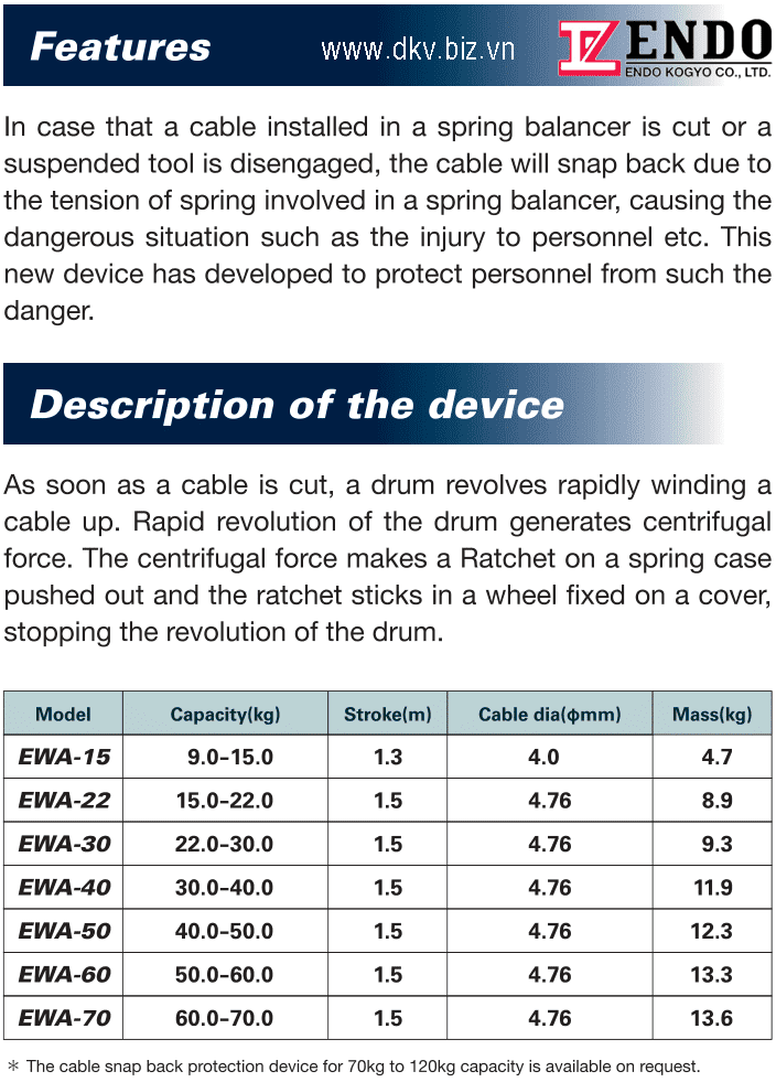 - Pa lăng cân bằng Endo EWA-30 có đường kính dây cáp: 4.76 (Φ mm)., được thiết kế nhỏ gọn, dùng để treo các vật dụng nhẹ như tô vít lực,máy khoan mini, dụng cụ tháo lắp dùng điện, thiết bị đo, vv....vv....
