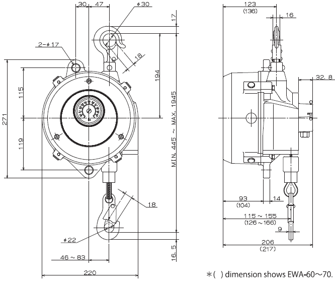 - Trọng lượng pa lăng cân bằng EWA-60 tiêu chuẩn: 13.3 kg.