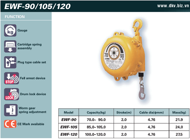 - Trọng lượng pa lăng cân bằng EWF-105 tiêu chuẩn: 24 kg.