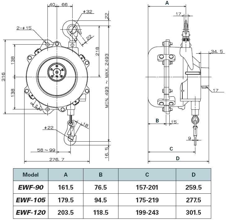 - Trọng lượng pa lăng cân bằng EWF-120 tiêu chuẩn: 27.5 kg.