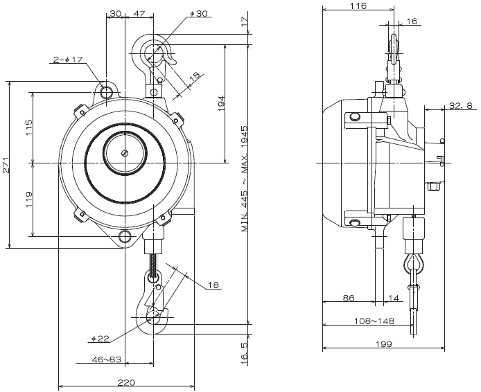 - Trọng lượng pa lăng cân bằng EWF-60 tiêu chuẩn: 11.1 kg.
