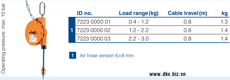 - Pa lăng cân bằng Carl Stahl Kromer 7223 0000 01, Carl Stahl Kromer balanced 7223 0000 01: là loại pa lăng cân bằng hay còn gọi (Pa lăng lò xo tự rút) có sức nâng max: 0.4 - 1.2 kg, hành trình nâng hạ max: 0.8 m, chuyên dùng để treo các loại súng hoặc vật dụng trong nhà xưởng, cần thao tác nhanh.