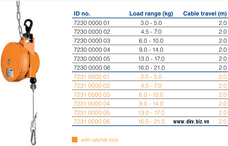 - Pa lăng cân bằng Carl Stahl Kromer 7231 0000 05, Carl Stahl Kromer balanced 7231 0000 05: là loại pa lăng cân bằng hay còn gọi (Pa lăng lò xo tự rút) có sức nâng max: 14 - 17 kg, hành trình nâng hạ max: 2 m, chuyên dùng để treo các loại súng hoặc vật dụng trong nhà xưởng, cần thao tác nhanh.