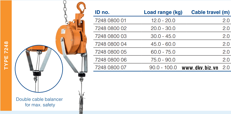 - Pa lăng cân bằng Carl Stahl Kromer 7248 0800 07, Carl Stahl Kromer balanced 7248 0800 07: là loại pa lăng cân bằng hay còn gọi (Pa lăng lò xo tự rút) có sức nâng max: 90 - 100 kg, hành trình nâng hạ max: 2 m, chuyên dùng để treo các loại súng hoặc vật dụng trong nhà xưởng, cần thao tác nhanh.