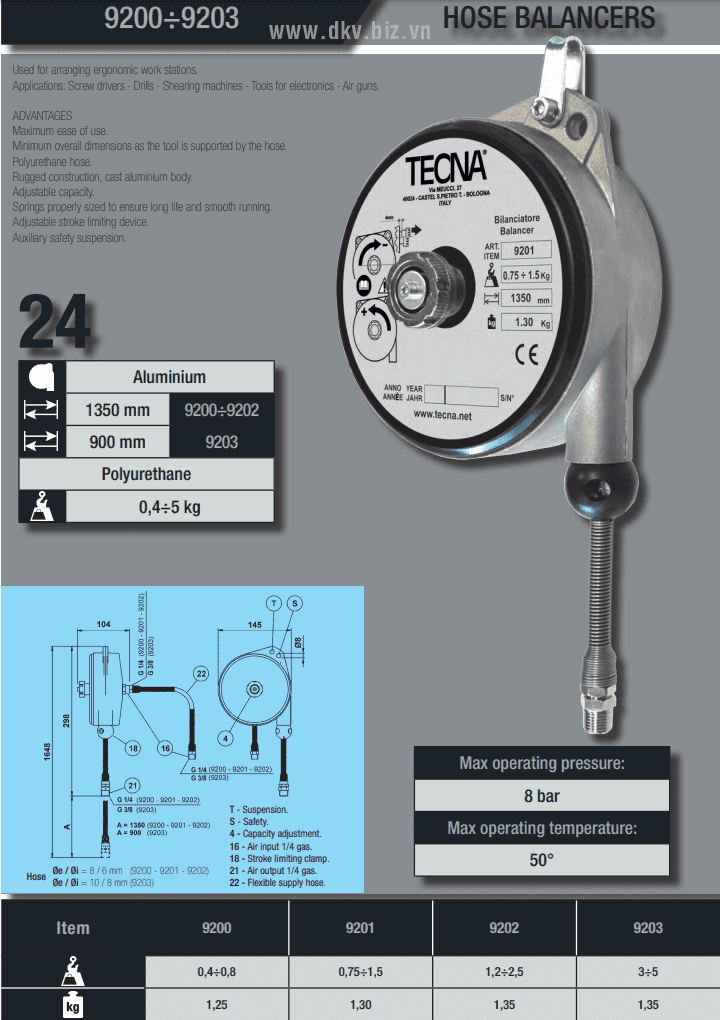 - Pa lăng cân bằng Tecna 9203, Tecna balanced 9203: là loại pa lăng cân bằng hay còn gọi (Pa lăng lò xo tự rút) có sức nâng max: 3 - 5 kg, hành trình nâng hạ max: 0.9 m, chuyên dùng để treo các loại súng hoặc vật dụng trong nhà xưởng, cần thao tác nhanh.