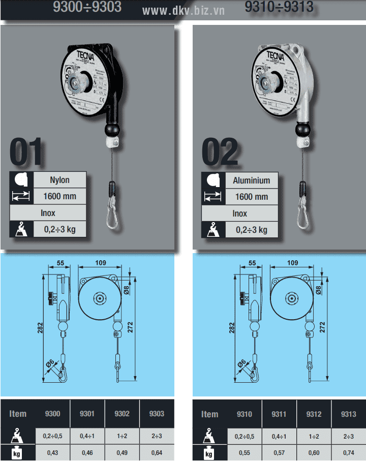 - Pa lăng cân bằng Tecna 9311 có mâm nhôm, cable treo bằng inox. Trọng lượng: 0.57 kg.