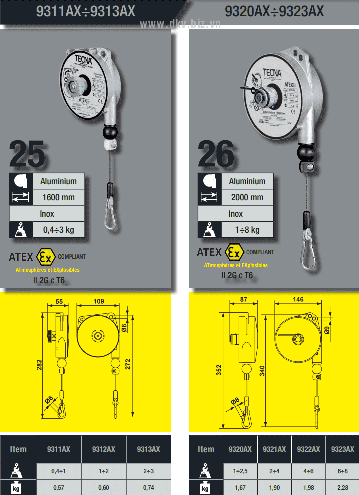 - Pa lăng cân bằng chống cháy nổ Tecna 9323AX có mâm nhôm, cable treo bằng inox. Trọng lượng: 2.28 kg.
