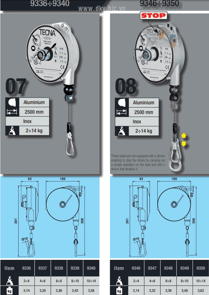 - Pa lăng cân bằng Tecna 9336 có mâm nhôm, cable treo bằng inox. Trọng lượng: 3.14 kg.
