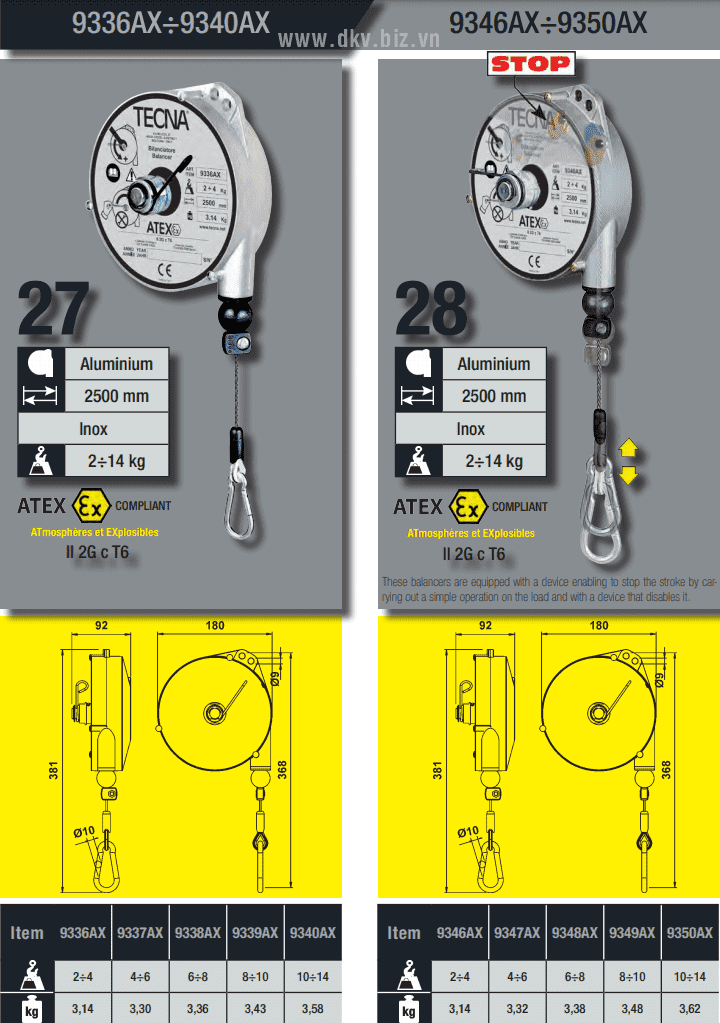 - Pa lăng cân bằng chống cháy nổ Tecna 9340AX có mâm nhôm, cable treo bằng inox. Trọng lượng: 3.58 kg.