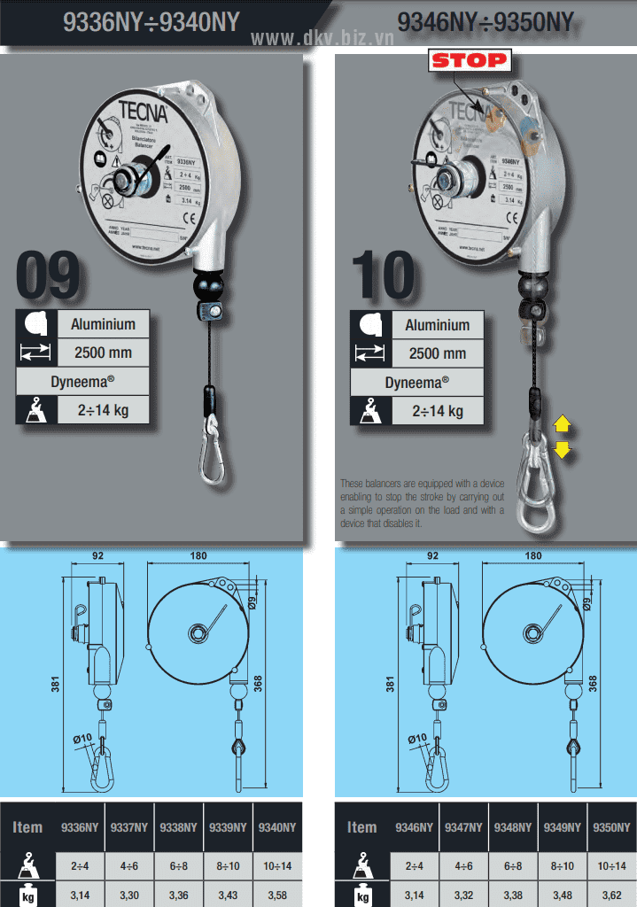 - Pa lăng cân bằng Tecna 9350NY, Tecna balanced 9350NY: là loại pa lăng cân bằng hay còn gọi (Pa lăng lò xo tự rút) có sức nâng max: 10 - 14 kg, hành trình nâng hạ max: 2.5 m, chuyên dùng để treo các loại súng hoặc vật dụng trong nhà xưởng, cần thao tác nhanh.