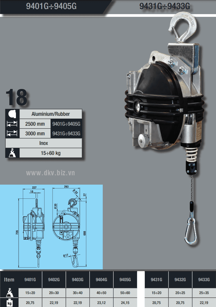 - Pa lăng cân bằng Tecna 9403G có mâm nhôm được bọc cao su, cable treo bằng inox. Trọng lượng: 22.19 kg.