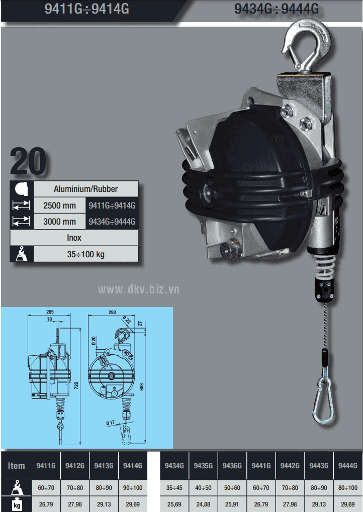 - Pa lăng cân bằng Tecna 9443G có mâm nhôm được bọc cao su, cable treo bằng inox. Trọng lượng: 29.13 kg.