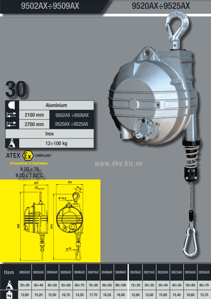 - Pa lăng cân bằng chống cháy nổ Tecna 9509AX có mâm nhôm, cable treo bằng inox. Trọng lượng: 16.8 kg.